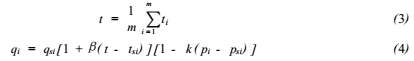 式中:t所有校準點在流量計處流體溫度的平均值,℃;m被校流量計的流量校準點數(shù)目;ti*i校準點在流量計處的流體溫度的平均值,℃;qi*i校準點被校流量計的實際流量,L/min;β流體的體積膨脹系數(shù),℃^-1;k流體的壓縮系數(shù),Pa^-1;pi*i校準點在流量計處的流體表壓力的平均值,Pa。