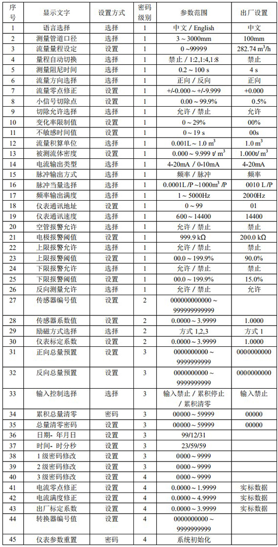 LDG 共有 45 個菜單項,使用除鹽水流量計時,用戶應根據(jù)具體情況設置或選擇各參數(shù)。LDG 菜單一覽表如下: