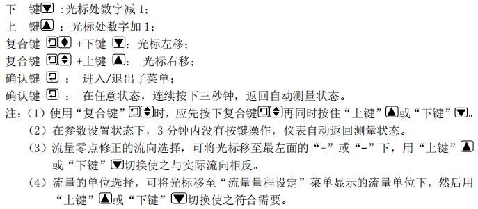 除鹽水流量計有兩個運行狀態(tài):自動測量狀態(tài)、參數(shù)設置狀態(tài)。除鹽水流量計上電時,自動進入測量狀態(tài)。在自動測量狀態(tài)下,除鹽水流量計自動完成各測量功能并顯示相應的測量數(shù)據(jù)。在參數(shù)設置狀態(tài)下,用戶使用四個面板鍵,完成儀表參數(shù)設置。